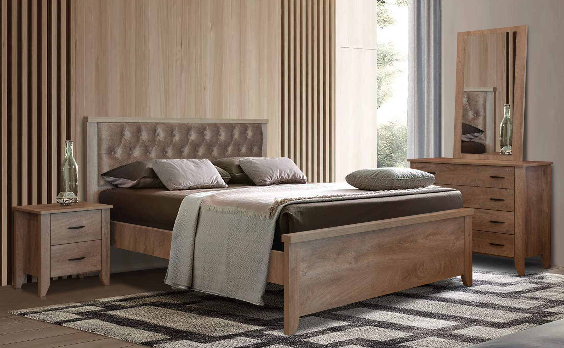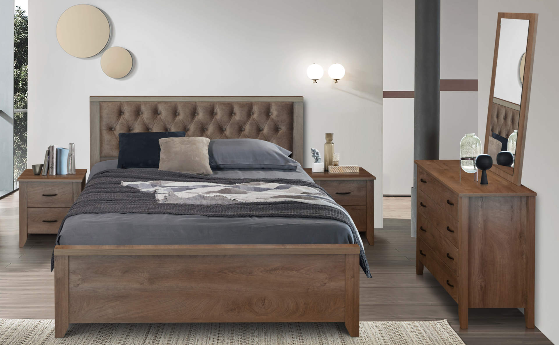 Η κρεβατοκάμαρα JULIA 82301 συνδυάζει σύγχρονη αισθητική και λειτουργικότητα, προσφέροντας ένα κομψό και πρακτικό σύνολο για τουριστικά καταλύματα. Το κρεβάτι ξεχωρίζει με το καπιτονέ κεφαλάρι του, το οποίο προσδίδει πολυτέλεια και άνεση στον χώρο. Το σετ περιλαμβάνει κομοδίνα και συρταριέρα με μεγάλο καθρέφτη, παρέχοντας αποθηκευτικό χώρο και κομψότητα. Είναι ιδανική επιλογή για τη δημιουργία ενός ζεστού και φιλόξενου υπνοδωματίου που θα εντυπωσιάσει τους επισκέπτες σας.