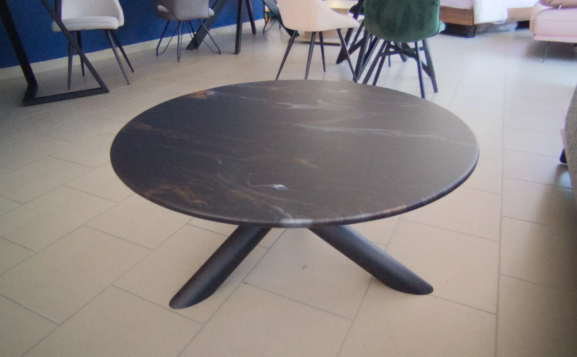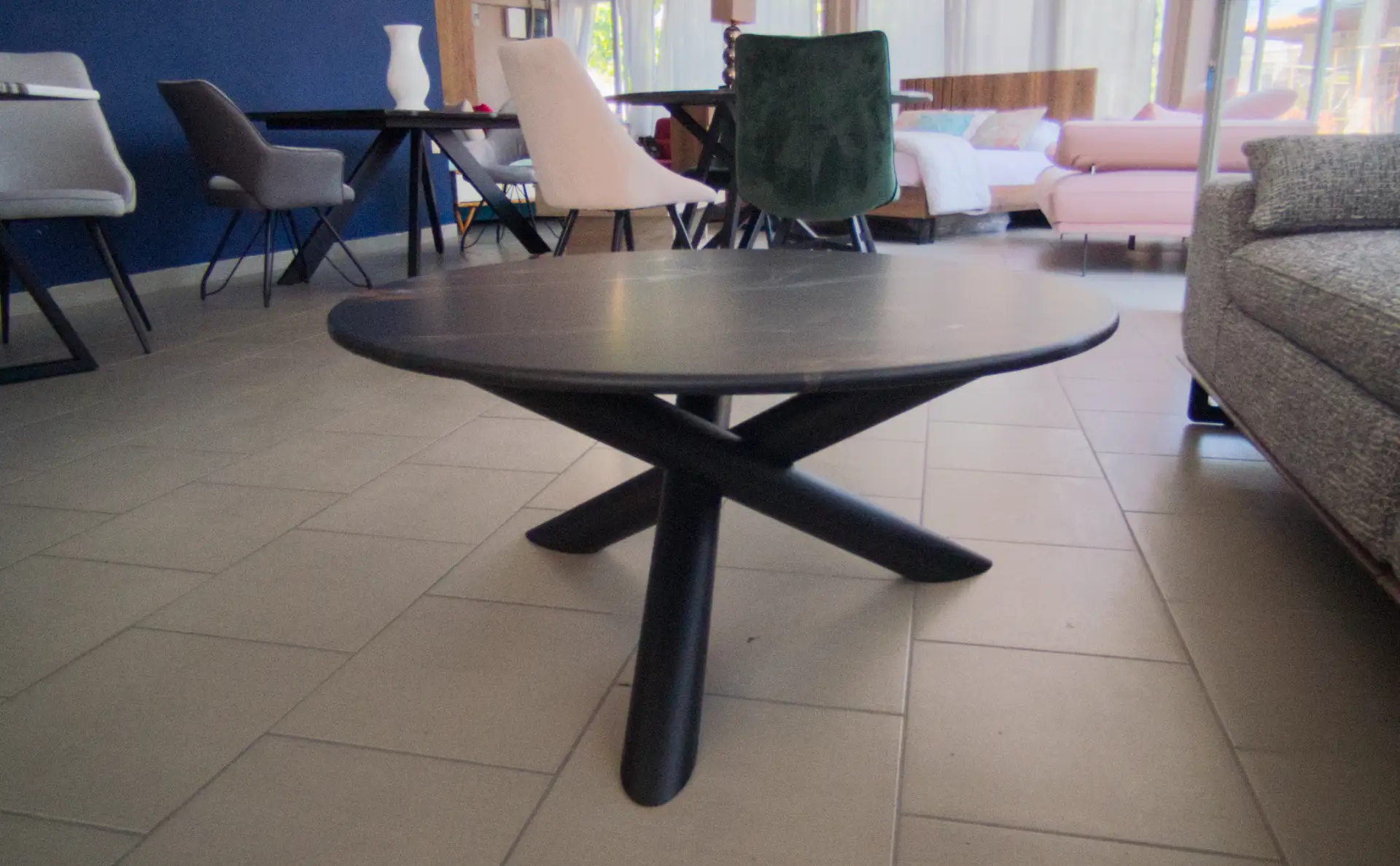 Τραπεζάκι σαλονιού με σύγχρονη minimal αισθητική με sculptural βάση. Διάμετρος Φ 90 εκ., ύψος 43 εκ.