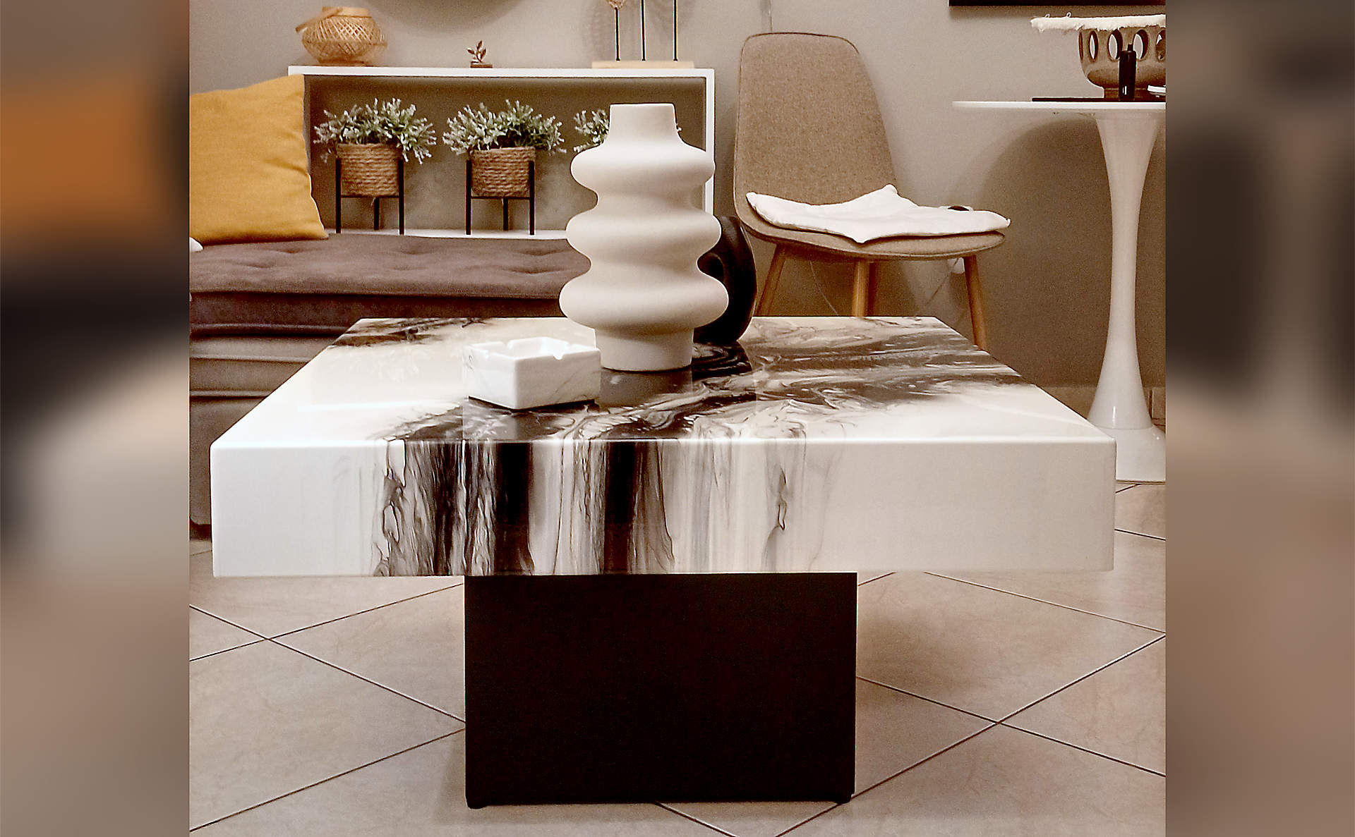Το Quad τραπεζάκι σαλονιού είναι ένας συνδυασμός σύγχρονης κομψότητας και μοναδικού σχεδιασμού. Η λευκή γυαλιστερή επιφάνεια με οργανικά μοτίβα σε μαύρες και γκρι αποχρώσεις αποπνέει πολυτέλεια και χαρακτήρα. Η στιβαρή γεωμετρική βάση υποστηρίζει με απόλυτη σταθερότητα το σχέδιο, δημιουργώντας μια ισχυρή οπτική αντίθεση που ταιριάζει ιδανικά σε σύγχρονους χώρους.