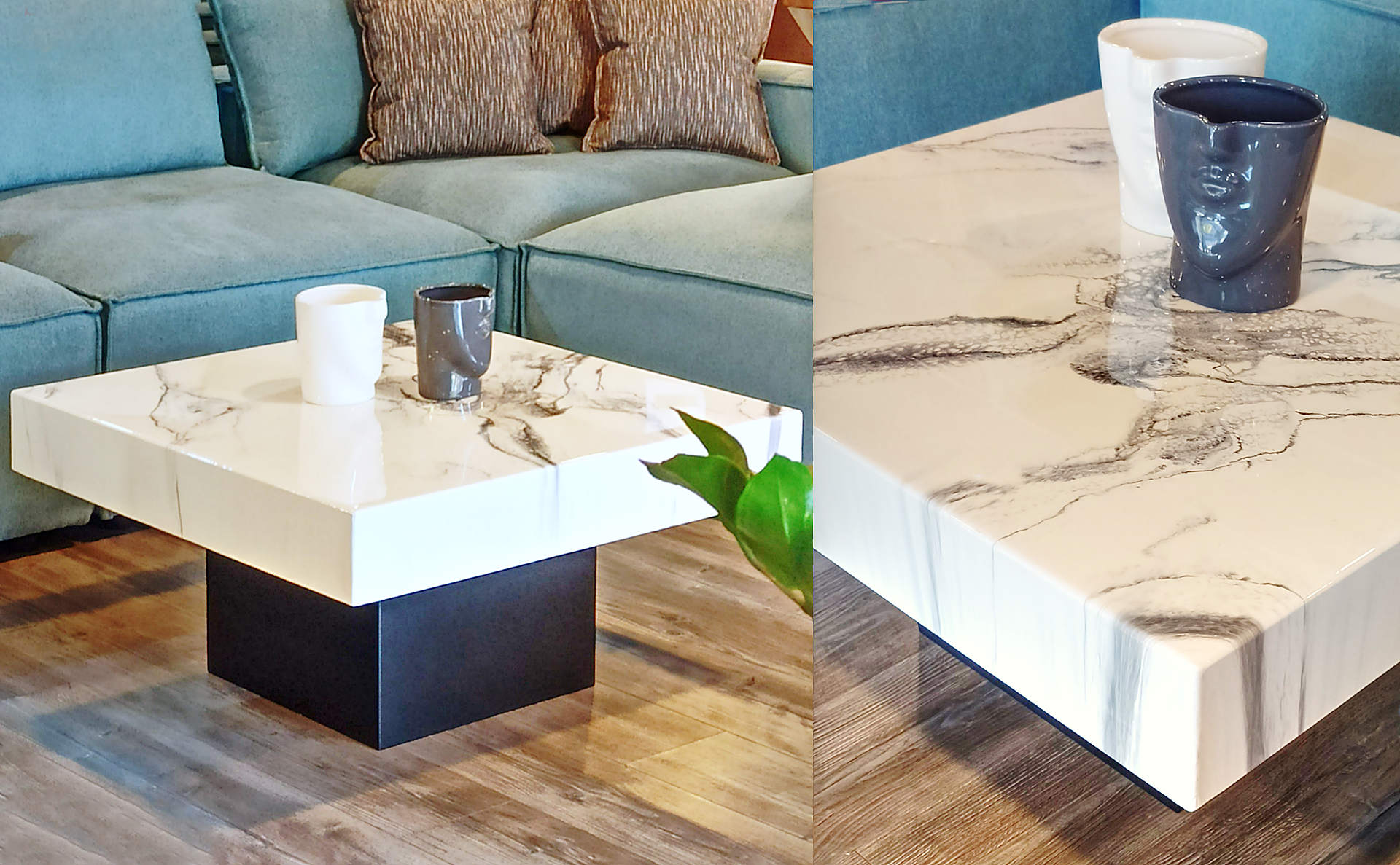 Τραπεζάκι σαλονιού με διαστάσεις 90×90×42 εκ., λευκή γυαλιστερή επιφάνεια με οργανικά μοτίβα και στιβαρή γεωμετρική βάση. Minimal σχεδιασμός που ενισχύει τη διαχρονική κομψότητα.