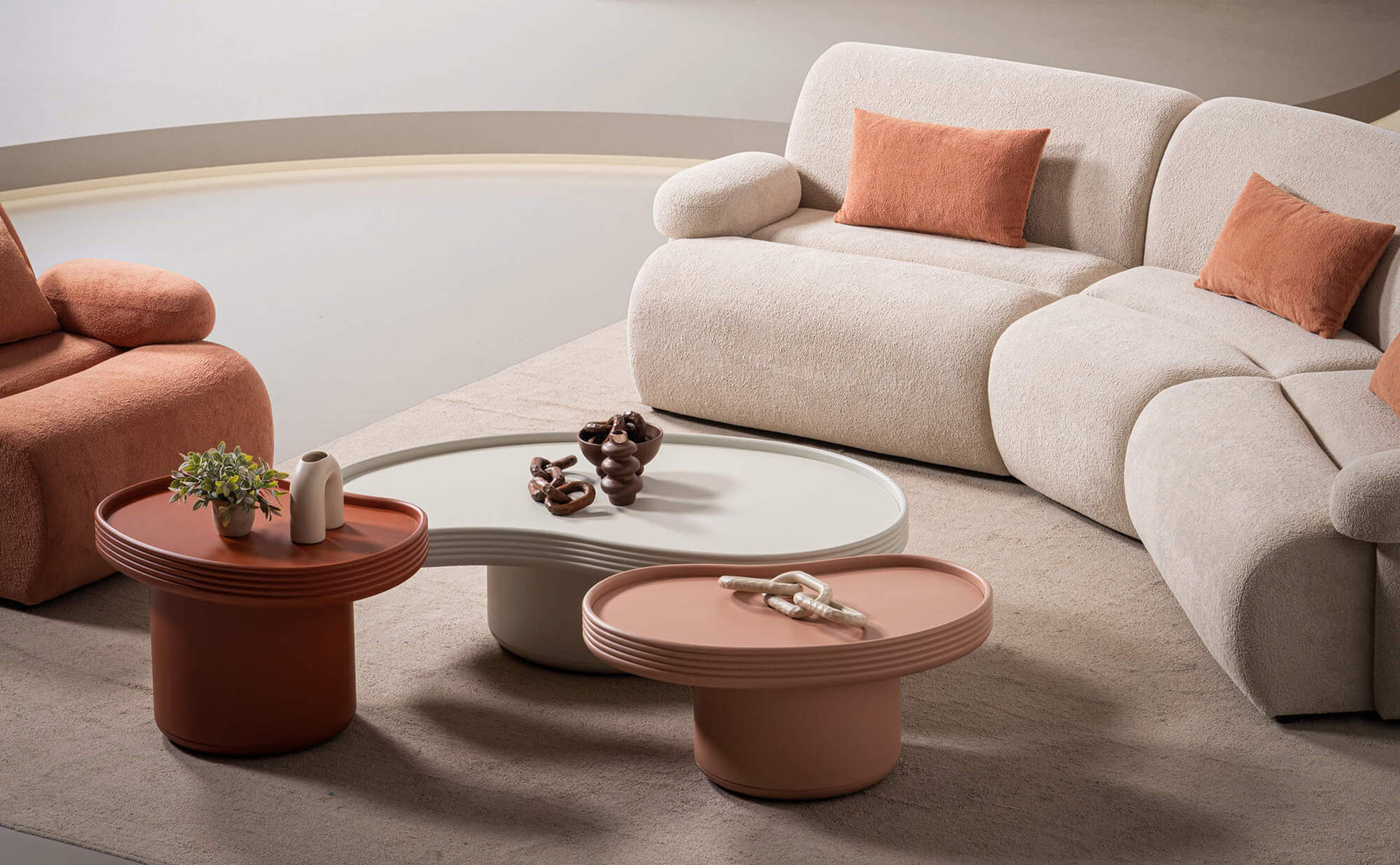 Σετ 3 τραπεζιών σαλονιού Kidney με μοντέρνο σχεδιασμό και καμπύλες γραμμές. Περιλαμβάνει τραπεζάκια διαφορετικού μεγέθους σε αποχρώσεις του γκρι, terracotta και ροζ. Συνδυάζει λειτουργικότητα και στυλ για κάθε σύγχρονο σαλόνι.