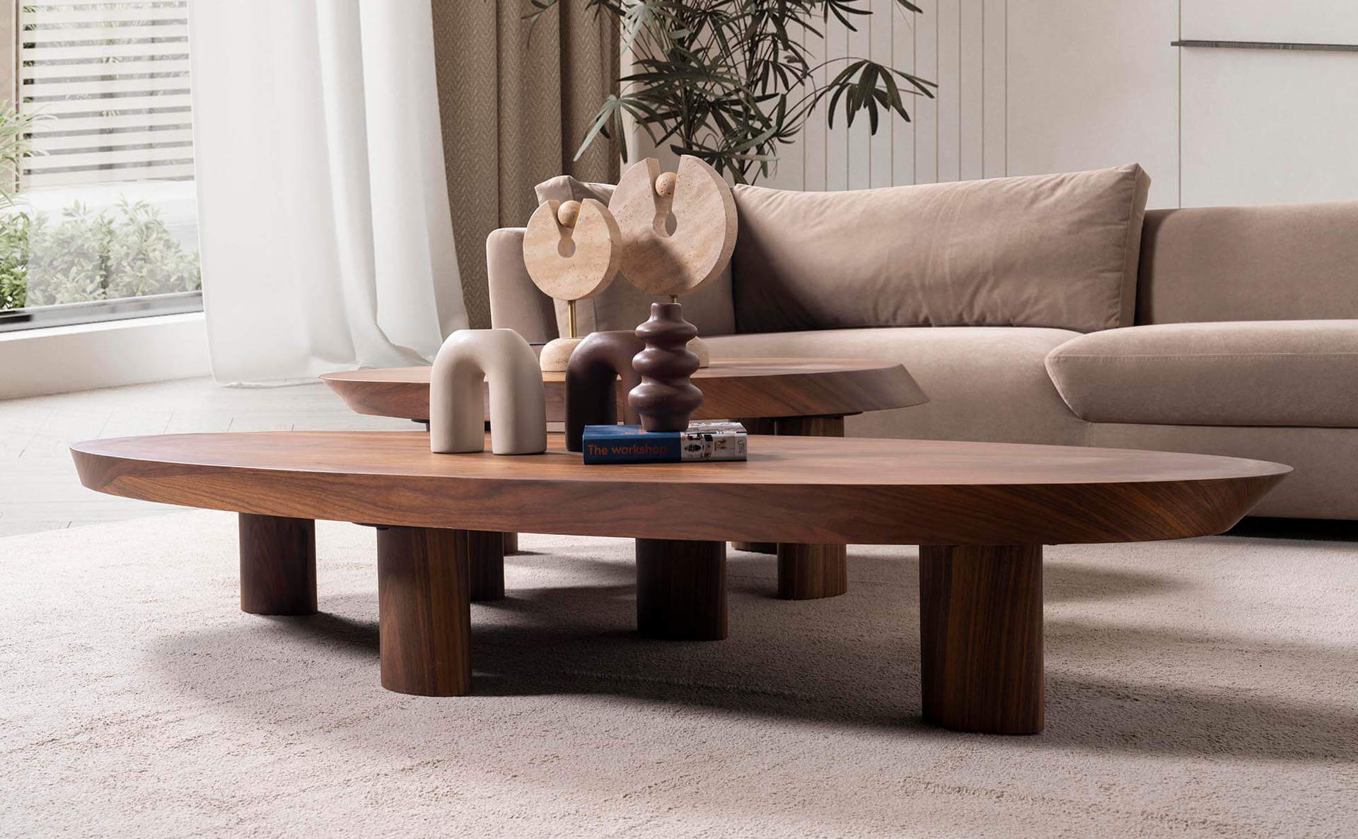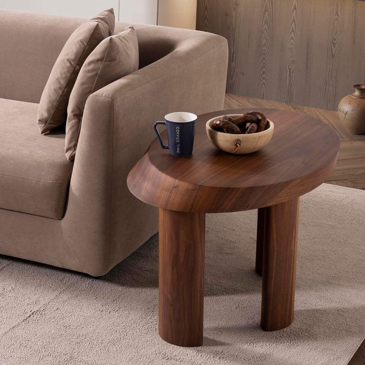 Σετ 3 τραπεζιών σαλονιού Mission με εμφάνιση καρυδιάς και minimal σχεδιασμό. Περιλαμβάνει τραπέζια σε οβάλ, στρογγυλό και βοηθητικό σχήμα που προσφέρουν ζεστασιά και λειτουργικότητα σε κάθε χώρο.